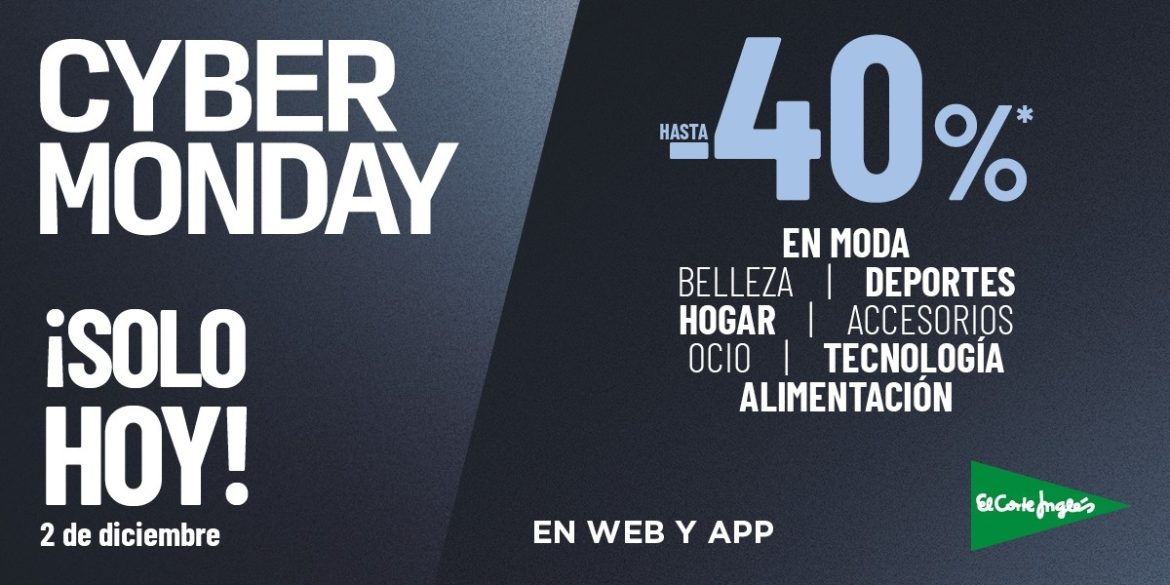 El Corte Inglés lanza por duodécimo año consecutivo el “Cyber Monday” con ofertas exclusivas online en todos sus departamentos con descuentos únicos de hasta el 40%. Durante todo el día de hoy, lunes 2 de diciembre, la web y la app de El Corte Inglés tendrán las mejores ofertas y promociones en moda, lencería, zapatería, accesorios, belleza, hogar, deportes, electrónica, electrodomésticos y alimentación.