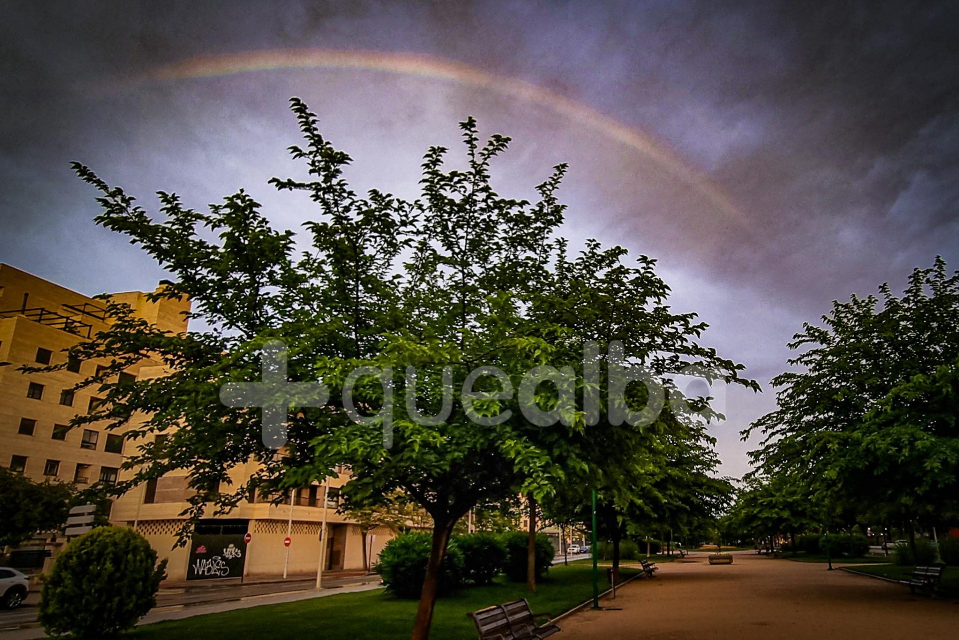 La imagen está tomada en el Paseo de la Cuba pero el arco iris ha podido verse desde muchos otros puntos de la ciudad de Albacete para despedir la tarde de este jueves.