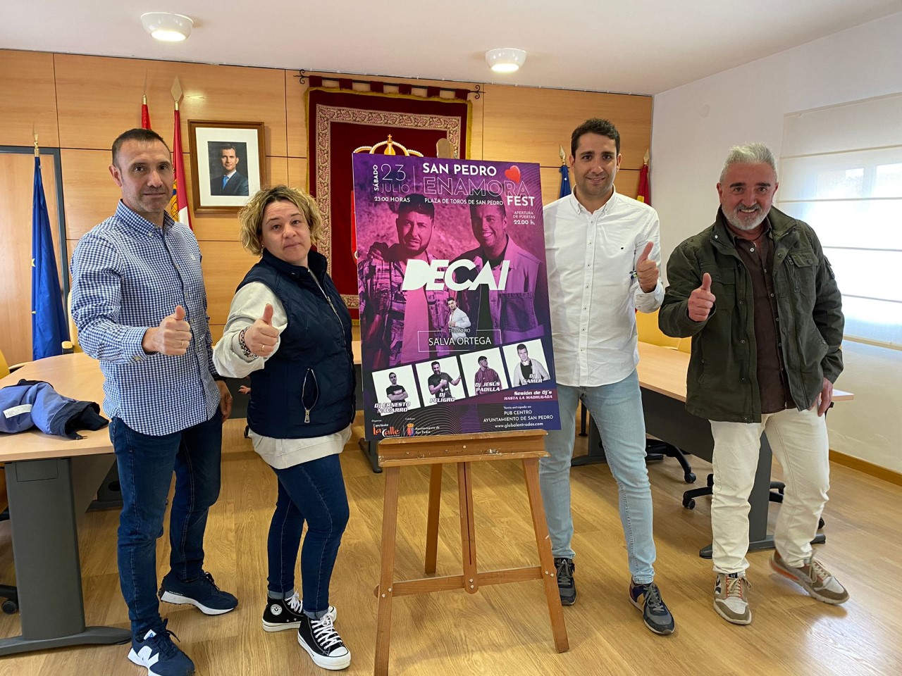 La Plaza de Toros de San Pedro acogerá, el próximo 23 de julio, el festival ‘San Pedro Enamora Fest’, un evento en el que el grupo ‘Decai’ será la principal atracción de la noche. En el día de hoy se ha presentado el cartel del festival, organizado de forma conjunta por el Ayuntamiento de San Pedro y Espectáculos La Calle.