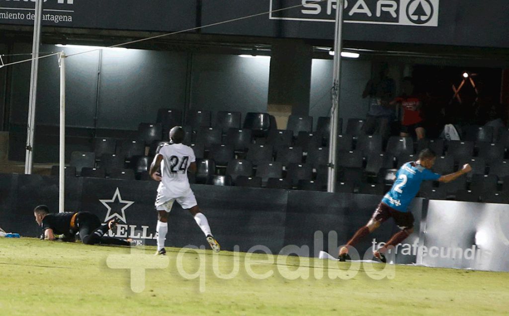 En el 40, se adelantaba el Cartagena. Jugada por la izquierda y Óscar Ramírez, solo, recibe en la derecha y fusila a Carvajal. Subía el 1-0 al marcador.