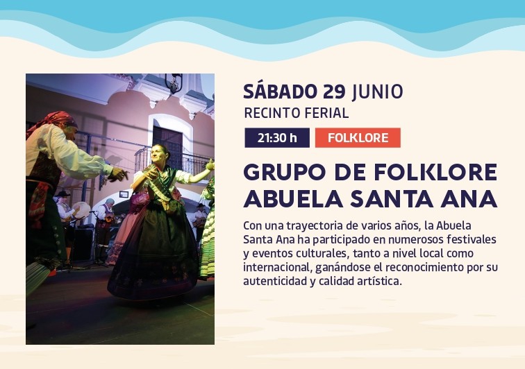Mañana, sábado 29 de junio a las 21:30 horas, como parte de la programación del verano cultural promovida por el ayuntamiento, el Grupo de Folklore Abuela Santa Ana, conocido por su gran trayectoria y calidad artística, se presentará en el Recinto Ferial para deleitar al público con su música y danzas tradicionales.