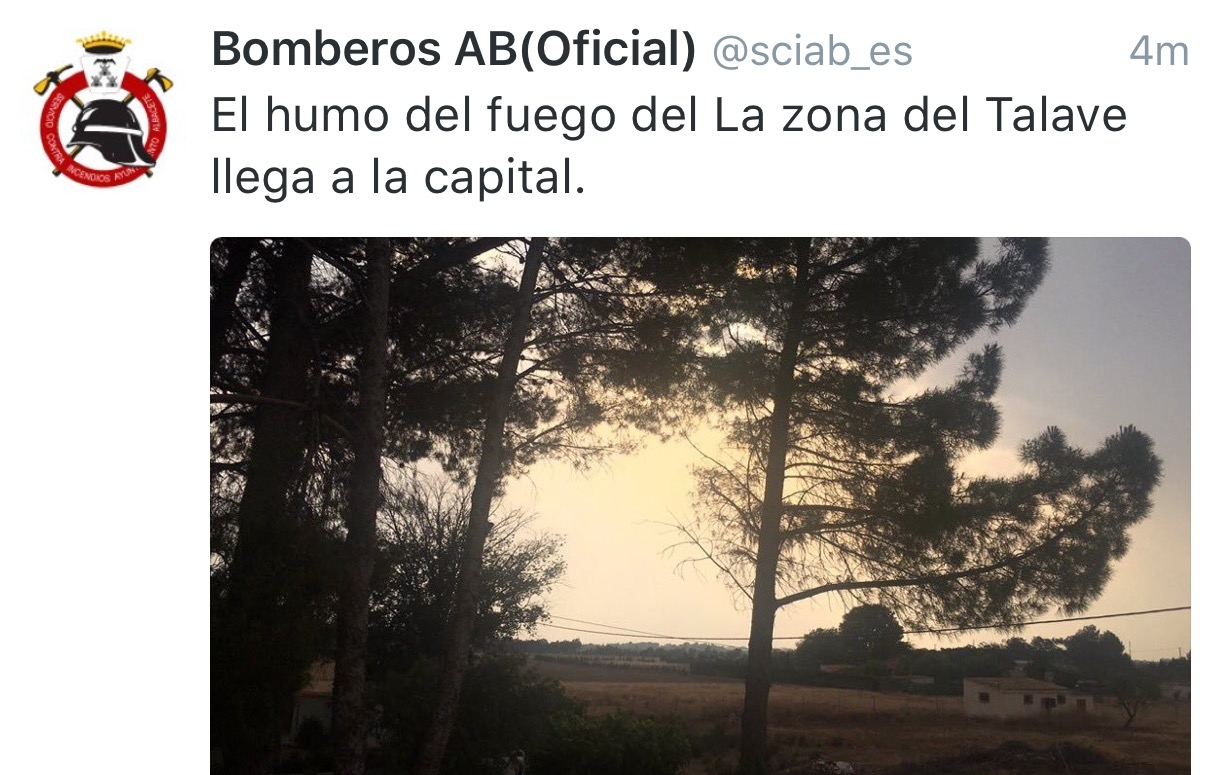 El humo del incendio que se declaraba esta tarde entre Liétor y Hellín se puede notar ya en la capital, como informan los Bomberos en su cuenta de Twitter. Es apreciable el humo desde zonas de la ciudad.