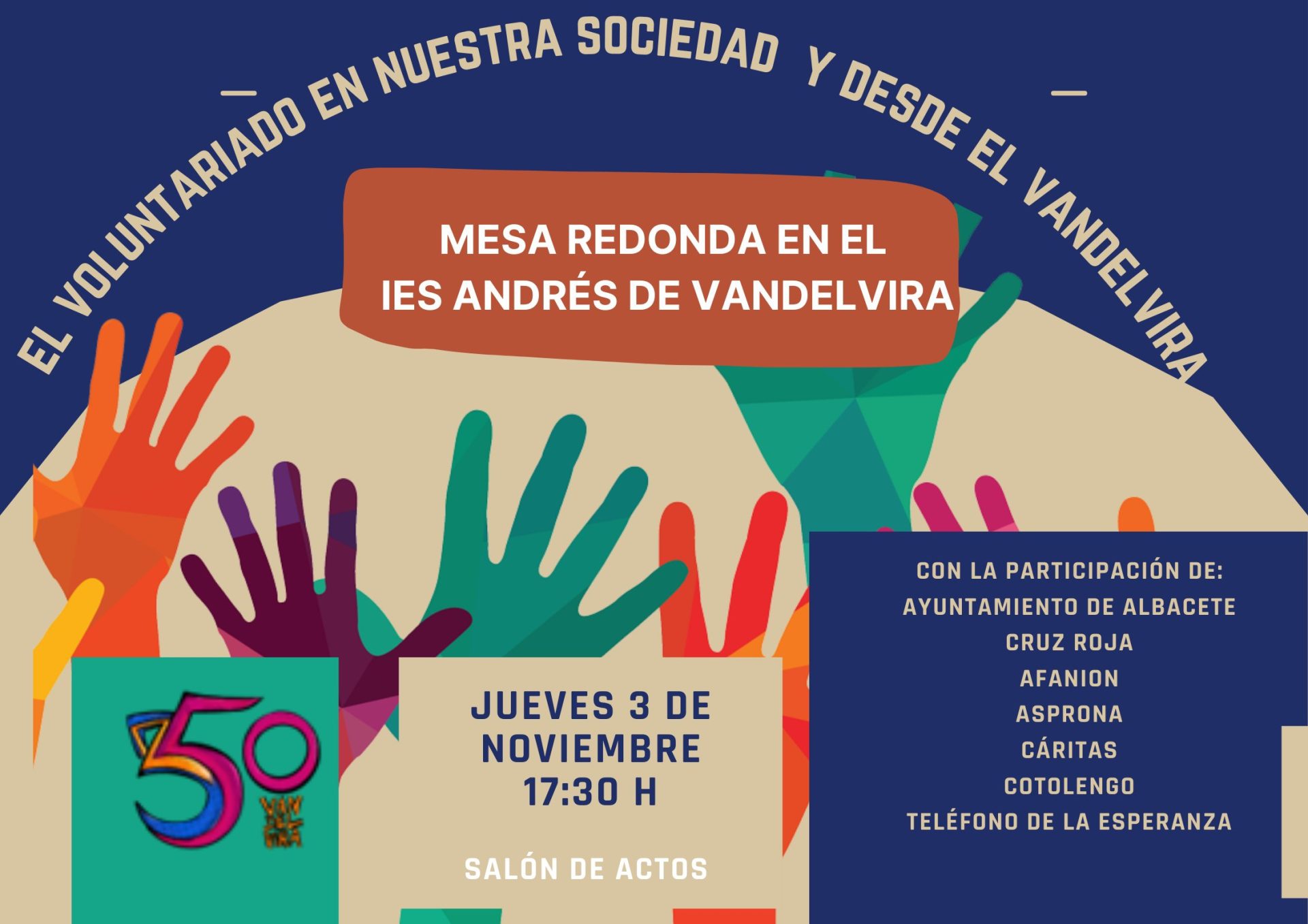 El próximo jueves, 3 de noviembre, a las 17:30 horas, el Instituto de Educación Secundaria (IES) Andrés de Vandelvira de la ciudad de Albacete celebrará una mesa redonda para promover el voluntariado.