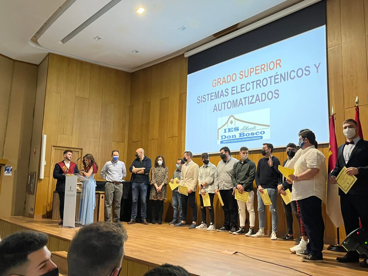 También se destacó a los alumnos del centro Epifanio Fernández López y Sergio Córcoles Torres que participaron en el campeonato nacional de Formación Profesional Spain Skills 2022, en la especialidad de Mecatrónica, y a Daniel Escribano Salvador, que participó en la especialidad de CNC Fresado. Este campeonato se celebró en Madrid desde el 22 al 26 del mes pasado. Los alumnos del IES Don Bosco obtuvieron la medalla de bronce en la especialidad de Mecatrónica.