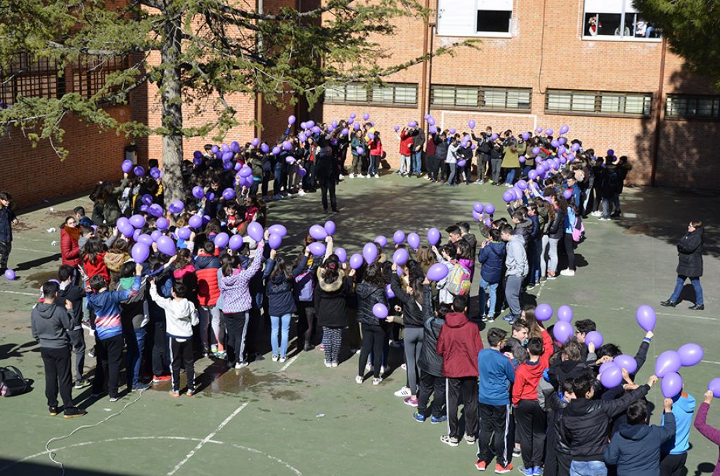 Los alumnos del primer ciclo de la E.S.O. realizaron un gran lazo humano violeta como forma simbólica de reclamar la igualdad, con una suelta de globos, y la lectura de poemas sobre la mujer.