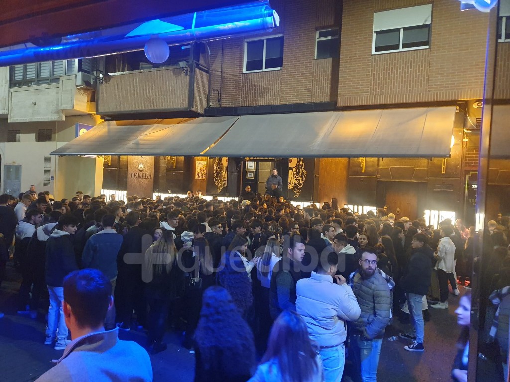 Miles de jóvenes siguen intentando celebrar el Jueves Lardero, esta madrugada, en la ciudad de Albacete. Y pasada la medianoche esta era la cola para intentar poder entrar a locales, en la calle Caldereros.