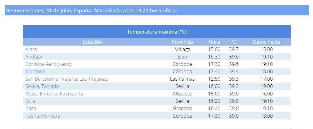 Eso sí, si ayer superaba los 40 grados, hoy ha marcado una máxima de 39, a las tres de la tarde. Y si ayer era el quinto municipio con mayor máxima de toda España, hoy es el séptimo.