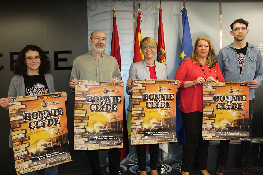 La concejal responsable de la Universidad Popular en el Ayuntamiento de Albacete, Llanos Navarro, junto a la presidenta de ACEPAIN, Joaqui Alarcón y representantes de la “Asociación Spirale” y del Conservatorio de Castilla La Mancha han presentado el musical “Bonnie y Clyde” que se celebrará en Albacete y donde parte de la recaudación irá destinada a la Asociación ACEPAIN.