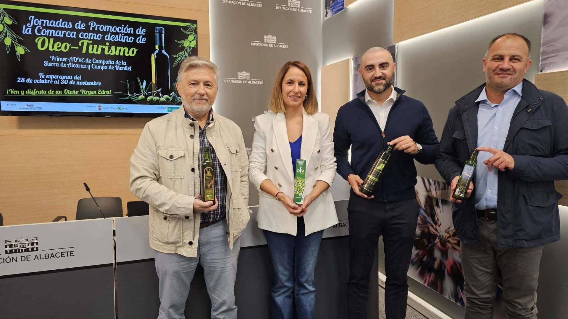 La Diputación de Albacete ha acogido la presentación de las ‘Jornadas de Promoción de la Comarca como destino de Oleo-turismo: primer AOVE de Campaña de la Sierra de Alcaraz y Campo de Montiel’. Ha sido en una rueda de prensa que ha contado con la participación del diputado de Medio Ambiente y consejero delegado del ITAP, José Antonio Gómez, la teniente de alcalde de Alcaraz (y también diputada provincial), Yolanda Ballesteros; y el secretario de la Asociación Tierra Verde, Javier Márquez. Además, ha asistido Juan Luis Tendero, de la Almazara de Bienservida.