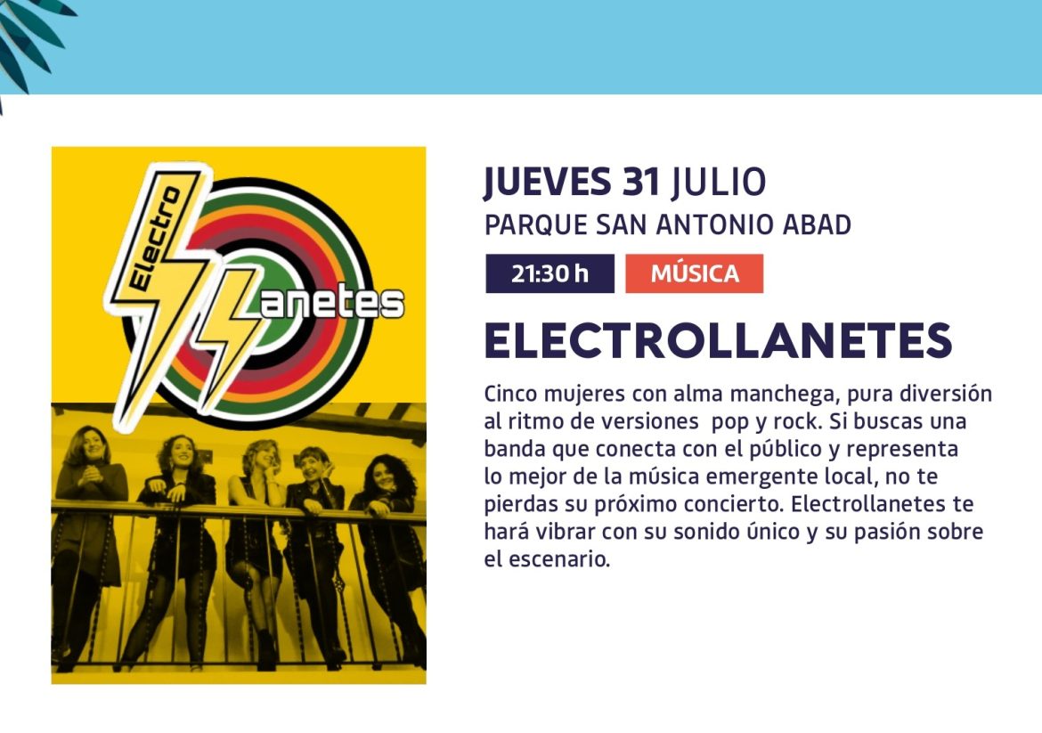 Mañana jueves, 31 de julio, el Parque San Antonio Abad se convertirá en un escenario al aire libre para recibir a Electrollanetes, una banda formada por cinco mujeres con alma manchega y mucha energía. A partir de las 21:30 horas, el público podrá vibrar con un repertorio de versiones pop y rock interpretadas con un estilo propio que conecta de inmediato con los asistentes.
