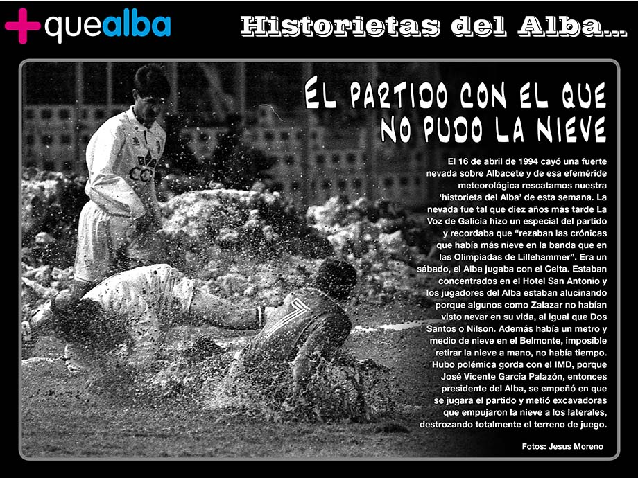 El 16 de abril de 1994 cayó una fuerte nevada sobre Albacete y de esa efeméride meteorológica rescatamos nuestra ‘historieta del Alba’ de esta semana. La nevada fue tal que diez años más tarde La Voz de Galicia hizo un especial del partido y recordaba que “rezaban las crónicas que había más nieve en la banda que en las Olimpiadas de Lillehammer”. Era un sábado, el Alba jugaba con el Celta. Estaban concentrados en el Hotel San Antonio y los jugadores del Alba estaban alucinando porque algunos como Zalazar no habían visto nevar en su vida, al igual que Dos Santos o Nilson. Además había un metro y medio de nieve en el Belmonte, imposible retirar la nieve a mano, no había tiempo. Hubo polémica gorda con el IMD, porque José Vicente García Palazón, entonces presidente del Alba, se empeñó en que se jugara el partido y metió excavadoras que empujaron la nieve a los laterales, destrozando totalmente el terreno de juego.