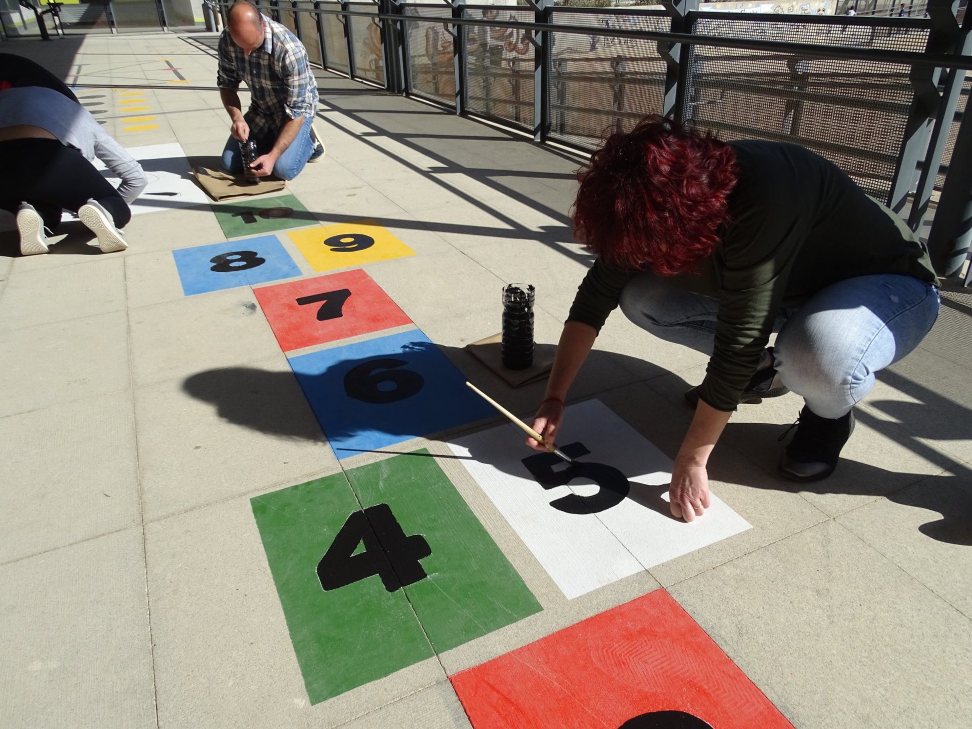 Rayuela, Twister, circuitos de actividades, juegos de mesa gigantes, y elementos geométricos, entre otros, han sido pintados para dar pie a jugar libremente, y hacer la hora del recreo más divertida.