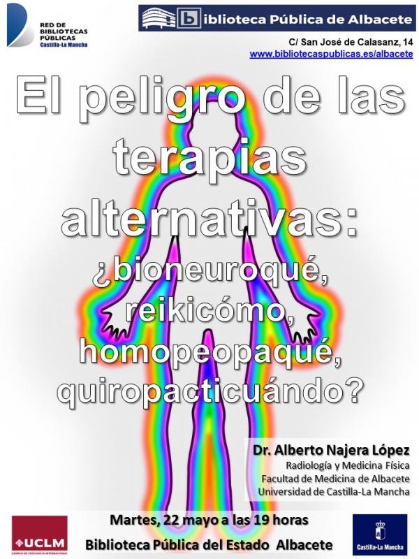 La Biblioteca Pública del Estado en Albacete acogerá este martes, 22 de mayo, a las 19.00 horas, una conferencia sobre El peligro de las terapias alternativas. ¿bioneuroqué, reikicómo, homeopaqué, quiropacticuándo?.
