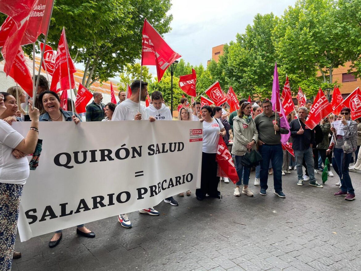 Continuando con la convocatoria de huelga para todos los martes de este mes de junio, los trabajadores y trabajadoras del Hospital Quirón Salud Albacete han vuelto a concentrarse esta mañana para reivindicar unos salarios y unas condiciones laborales dignas, y un convenio colectivo que les permita, entre otras cosas, recuperar el poder adquisitivo perdido en los últimos cinco años.