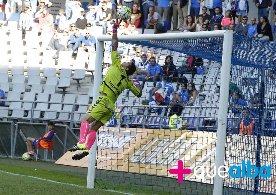 Esteban, el meta del Oviedo, tiene cuarenta años, pero muy bien llevados. Vaya paradones hizo a ocasiones del Alba como las de Diego Benito, César Díaz o incluso Pulido, que vemos en esta imagen. Salvó los puntos para su equipo en una tarde en la que el Alba mejoró su imagen pero no tuvo nada de suerte.