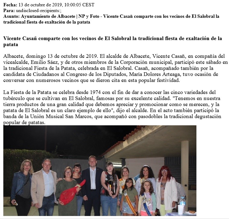 En concreto, Llanos Navarro se refiere a la nota de prensa remitida por el Gabinete de Prensa de Alcaldía en la que se citaba textualmente que “el alcalde de Albacete, Vicente Casañ, en compañía del vicealcalde, Emilio Sáez, y de otros miembros de la Corporación municipal, participó este sábado en la tradicional Fiesta de la Patata, celebrada en El Salobral. Casañ, acompañado también por la candidata de Ciudadanos al Congreso de los Diputados, María Dolores Arteaga, tuvo ocasión de conversar con numerosos vecinos que se dieron cita en esta popular festividad”.