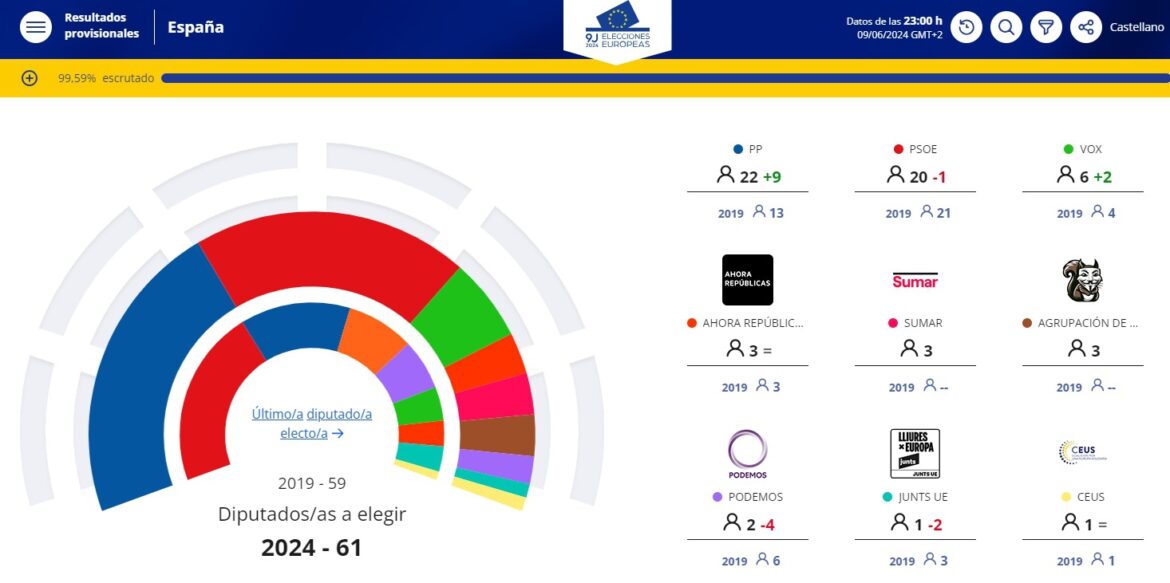 El PP ha pasado de los 13 eurodiputados que sacó en 2019 a 22 y gana las Europeas del 9-J en España, si bien el PSOE aguanta, pierde un único representante y se queda con 20 eurodiputados.
