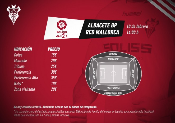 La venta de las entradas para el partido que del Alba, el domingo 10 de febrero a las 16 horas, contra el RCD Mallorca, una vez concluida la promoción de entradas del martes 5 de febrero, se realizará en la Ciudad Deportiva Andrés Iniesta desde el miércoles 6 de febrero hasta el jueves 7 de febrero de 10:00 a 13:30 y de 16:00 a 19:00 horas. Así como el viernes 8 de febrero de 10:00 a 14:00 horas y el sábado 9 de febrero en las taquillas de estadio Carlos Belmonte de 11:00 a 13:30 horas. El día de partido las taquillas del estadio estarán abiertas desde las 12:00 horas. Por cierto, que en los últimos partidos los niños -que empezaron pagando 5 euros- pagan 10. Y ya se venden entradas en Tribuna, tras la excelente entrada de las citas anteriores.