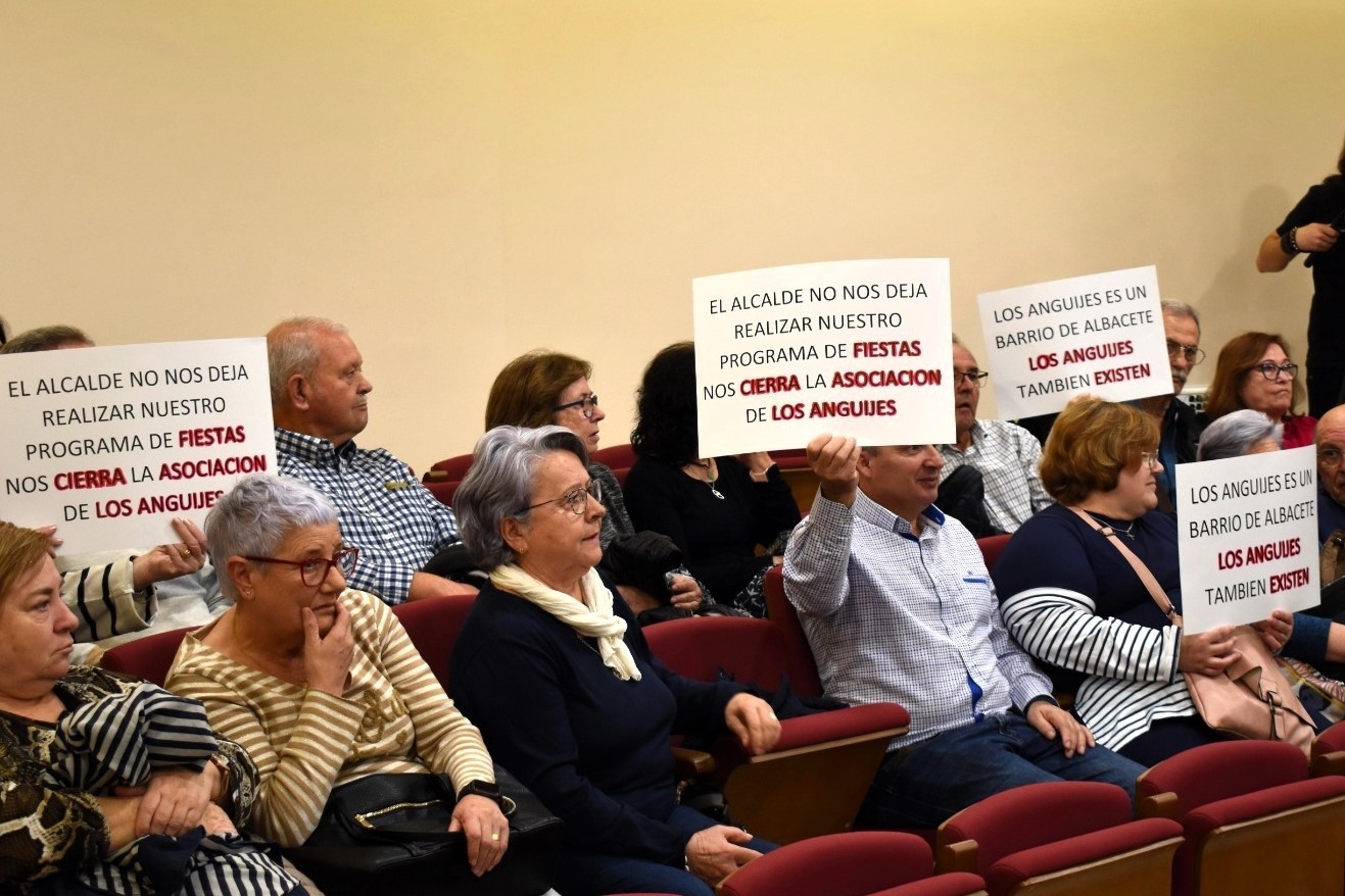 Entre el público asistente al Pleno de hoy también se encontraban socios y socias de la Asociación de Vecinos de Los Anguijes, quienes han protestado mostrando unas pancartas denunciando que el alcalde no les permite celebrar las fiestas en honor a su patrona, la Virgen de la O, el próximo 18 de diciembre, cerrándoles el local. En una carta que han registrado en la Oficina Municipal de Atención a la Ciudadanía (Omaci), afirman que no podrán llevar a cabo su programa de actividades.