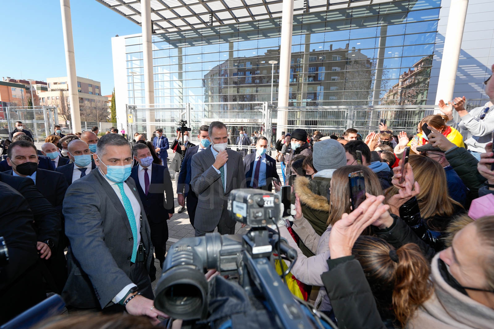 Cientos de personas esperaban la llegada del Rey en las inmediaciones de la Ciudad de la Justicia con pancartas de «Viva el Rey», lema que también se ha escuchado en gritos de los presentes. El Rey se ha llevado el aplauso de los vecinos, como también después de los trabajadores de la Ciudad de la Justicia, en un recorrido al que no han podido acceder los medios de comunicación.