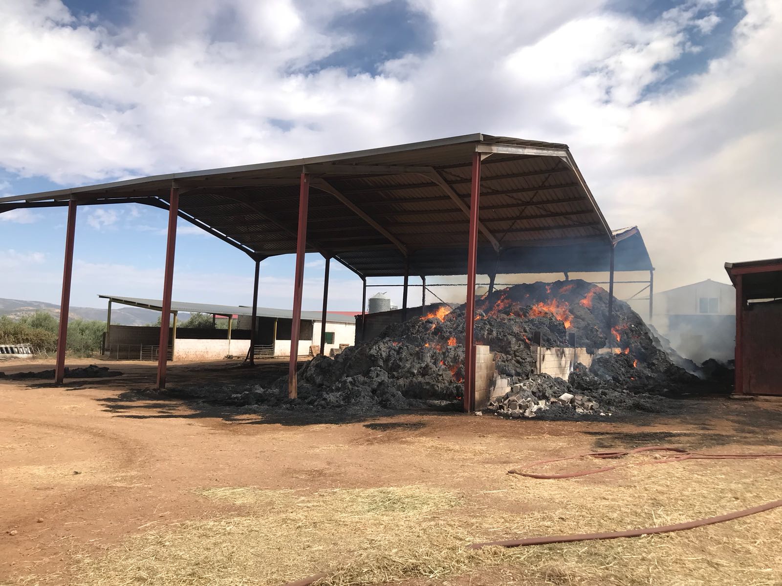 Distintas dotaciones de los Bomberos del SEPEI trabajan en la extinción de un incendio, ya controlado, en una nave de almacén de paja en Villapalacios.