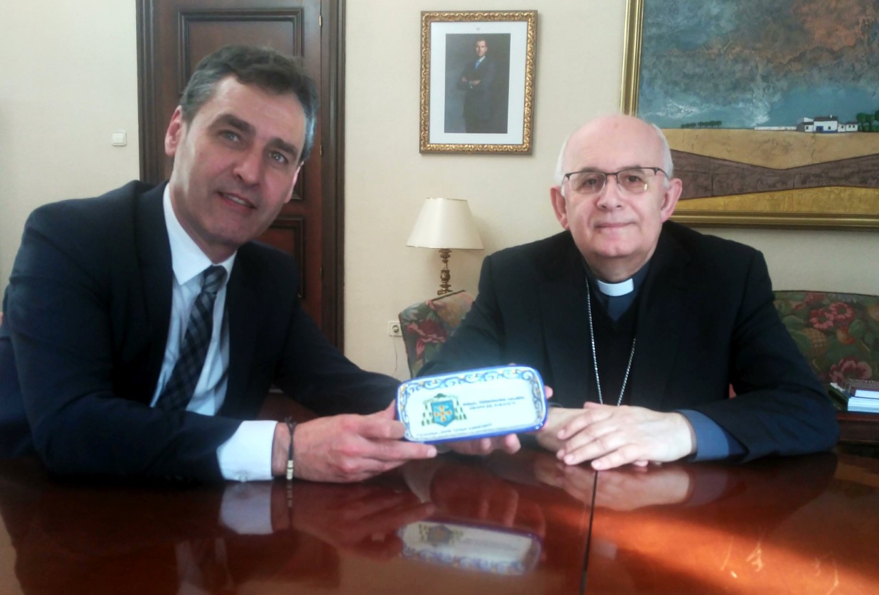 Ángel Fernández le ha hecho entrega al subdelegado de un obsequio consistente en un platillo de cerámica de Talavera con los símbolos del anillo de Obispo. Francisco Tierraseca ha dado la bienvenida al Obispo a su nueva diócesis y se ha puesto a su disposición en cuantos temas puedan colaborar las dos instituciones.