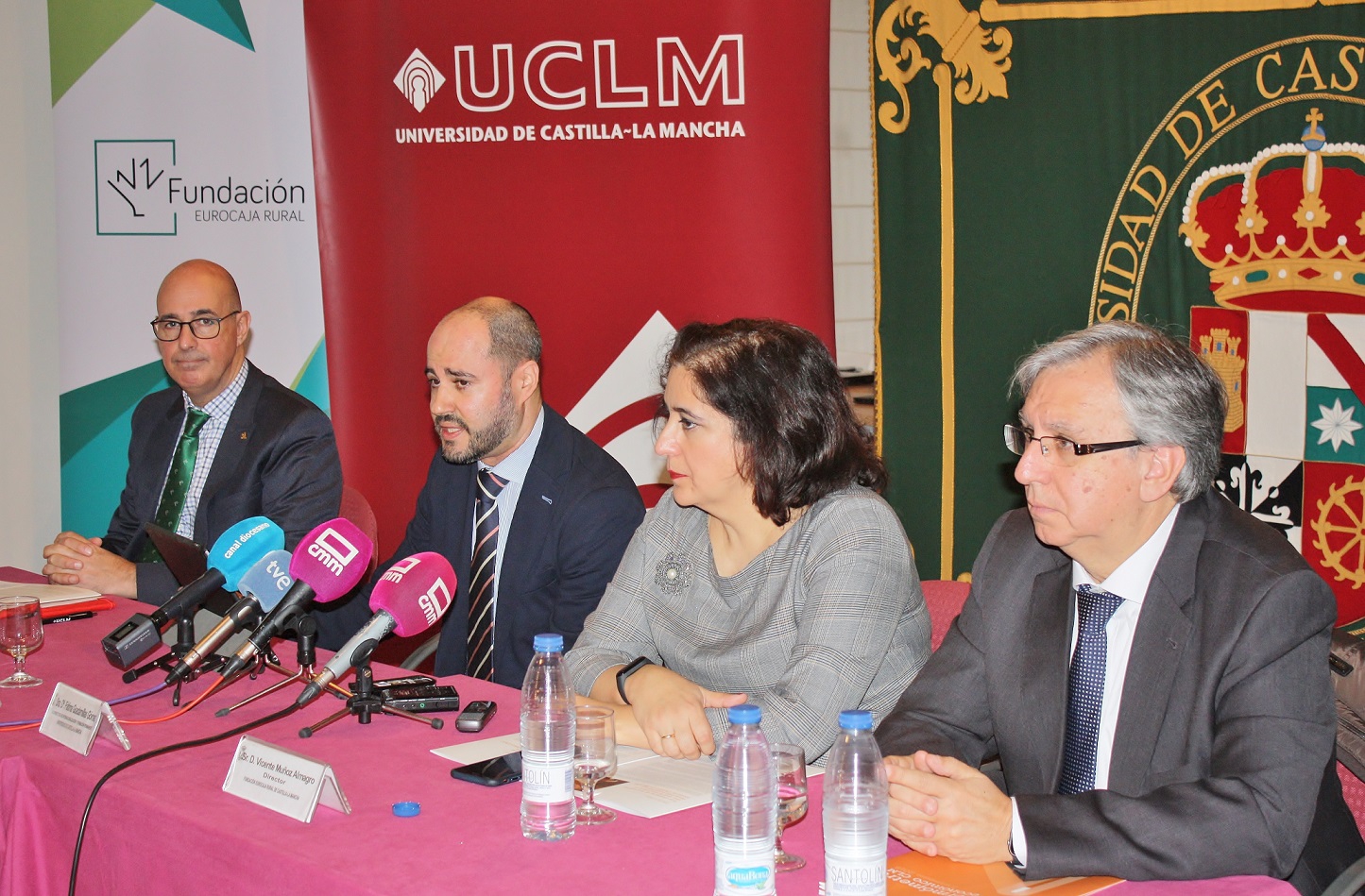 El Termómetro Económico de Castilla-La Mancha ha sido presentado esta mañana en la Facultad de Ciencias Jurídicas y Sociales de Toledo por el gerente de la Fundación Eurocaja Rural, Vicente Muñoz, la vicerrectora de Internacionalización y Formación Permanente de la UCLM, Fátima Guadamillas, el profesor Mario Donate, coordinador del Termómetro, y el catedrático de la UCLM Juan Carlos López, en presencia del director de la División de Relaciones Institucionales de Eurocaja Rural, Miguel Ángel Escalante Pinel.