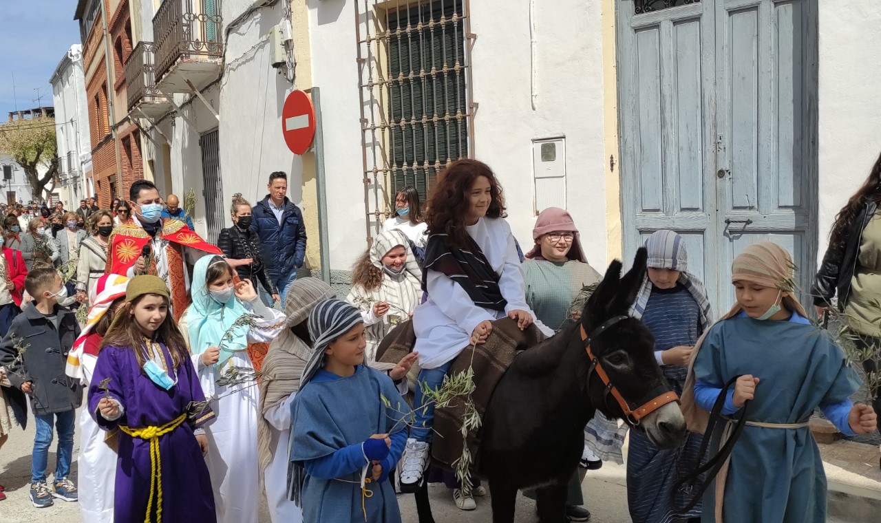 El Domingo de Ramos los niños de primera comunión protagonizan la procesión de la Entrada triunfal de Jesús en Jerusalén y el viernes de Dolores, los jóvenes representan en las calles del pueblo el Vía Crucis