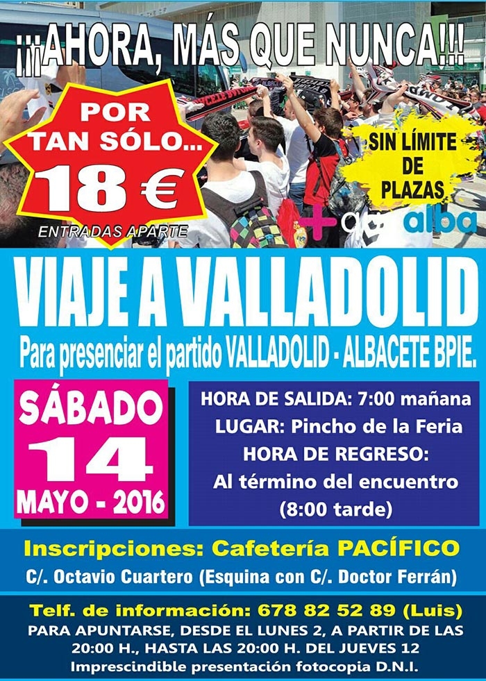 El viaje de aficionados a Valladolid para ver al Alba este sábado necesita un último empujón. Quedan nueve plazas para que salga, por lo que los organizadores animan a los aficionados a animarse a ir a este encuentro. MasqueAlba colabora con el viaje regalando dos billetes en el autobús, cuyo ganador se dará a conocer esta noche a las 21.00 horas. Además, los organizadores regalan otros dos billetes para el viaje en autobús que daremos también a través de la web. Si hay alguna empresa más interesada en colaborar con la iniciativa, los organizadores animan a ello.