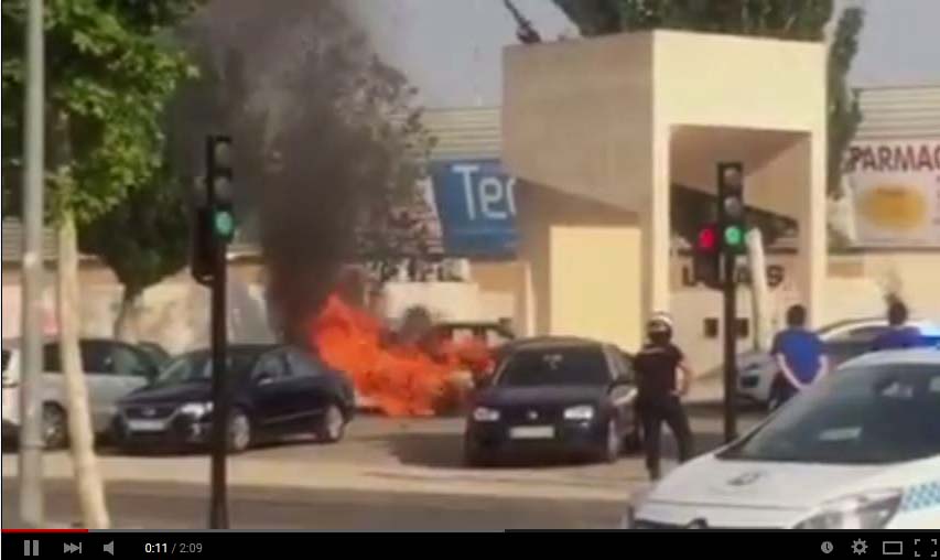 Buen susto se han llevado esta tarde los propietarios de un Audi negro y los vecinos de Albacete que transitaban por la zona del Carlos Belmonte al ver el coche en llamas. Por suerte solamente han sido daños materiales aunque el susto fue importante, el video de Víctor Hernández nos muestra lo sucedido. La rápida actuación de los Bomberos fue también importante.