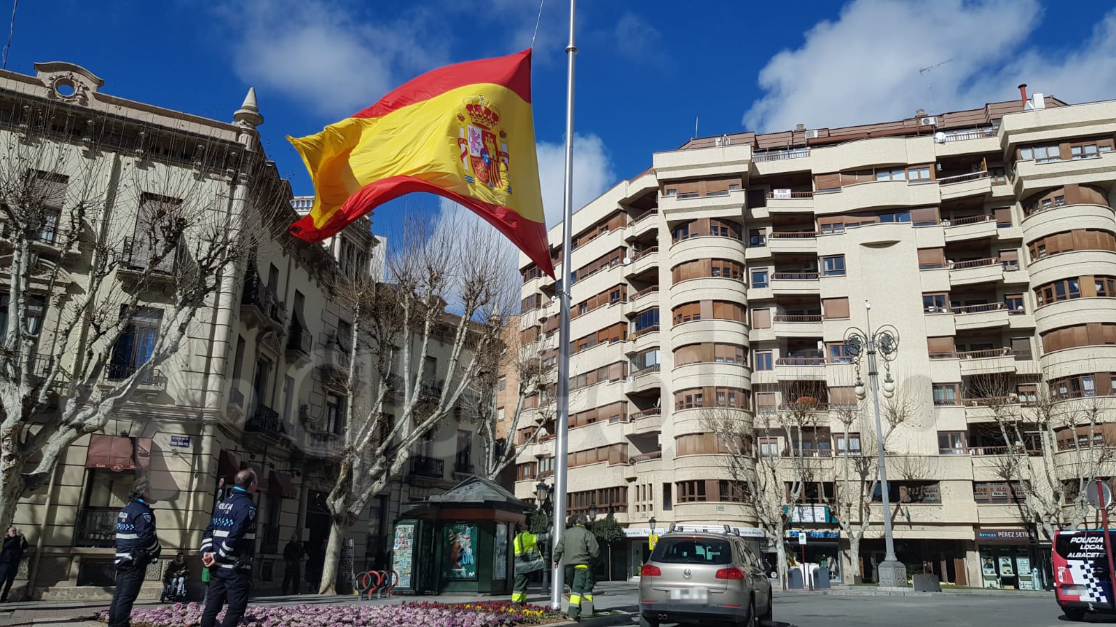 El temporal de viento que azota a Albacete ha obligado este mediodía a retirar la gran bandera de España que hay colocada en la Punta del Parque, en la Plaza Gabriel Lodares. Operarios municipales han retirado la bandera, con la colaboración de Policía Local.