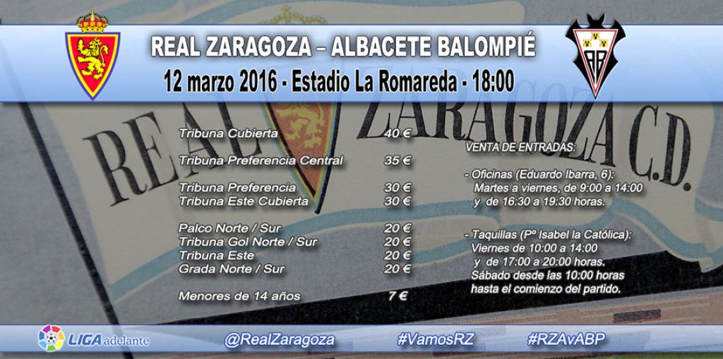A partir de este martes ya pueden adquirirse las entradas para el partido entre el Real Zaragoza y el Albacete Balompié, correspondiente a la vigésimo novena jornada de la Liga Adelante, que se disputará el próximo sábado a las 18:00 horas en el estadio de La Romareda. Los blanquillos afrontan un nuevo compromiso liguero con la meta de lograr un nuevo triunfo ante sus aficionados, que les permita avanzar un paso más en su escalada hacia las posiciones de privilegio del campeonato.
