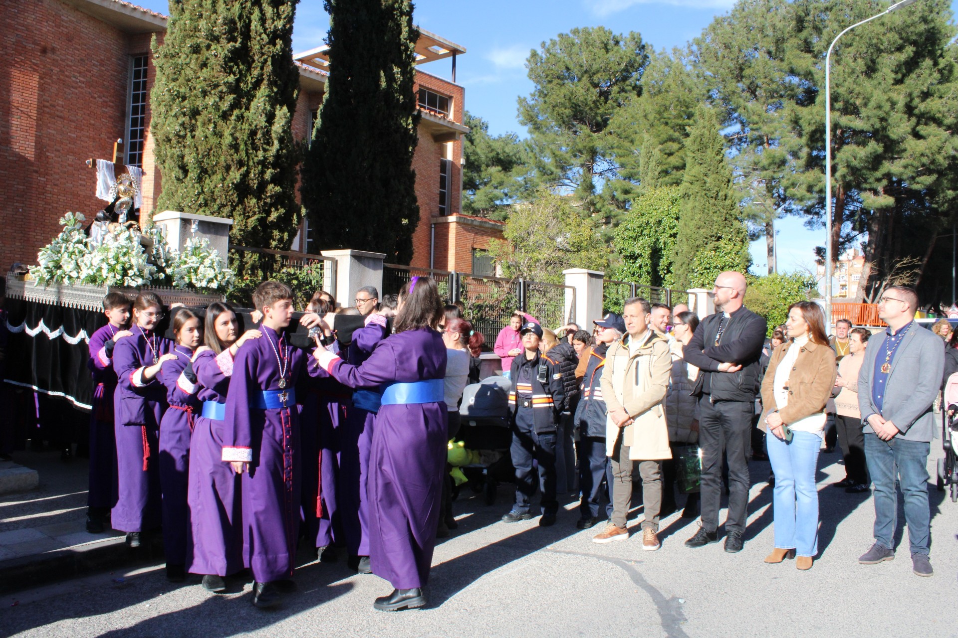 La procesión ha partido un año más desde la capilla de Nuestra Señora de las Angustias hasta el Asilo de San Antón, donde ha tenido lugar una convivencia intergeneracional entre las personas mayores residentes y nazarenos que ha finalizado con la interpretación de la Marcha Real.