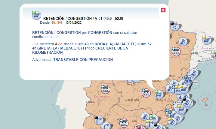 Este miércoles, 13 de abril, comenzaba la segunda fase de la Operación Salida por las vacaciones de Semana Santa y, desde cerca de las 19,30 horas, la Dirección General de Tráfico informa que ya hay problemas por retenciones en la A-31, en sentido levante, entre La Roda y La Gineta. A las 20 horas el aviso pasaba ya a nivel amarillo, ante el incremento de las retenciones.