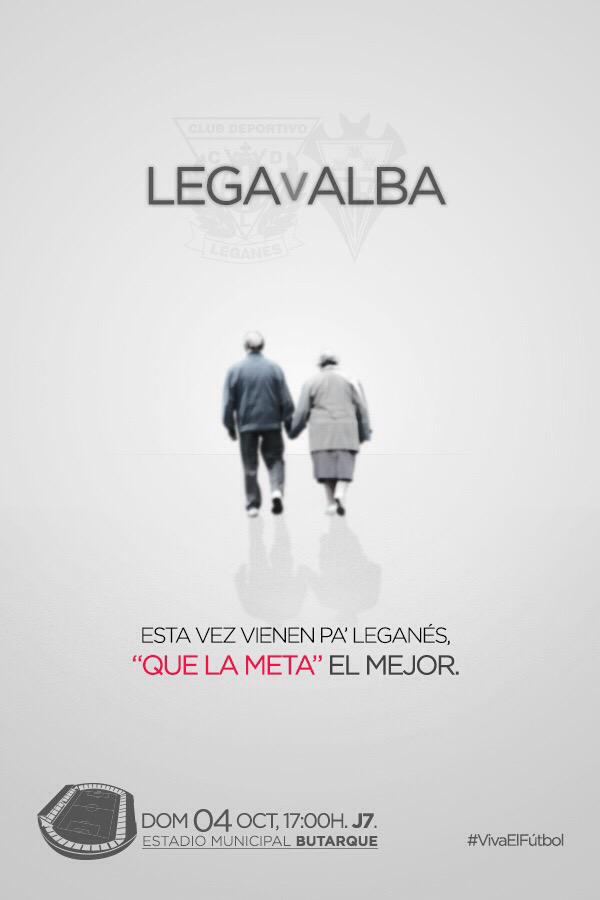 En el Leganés han tirado de tópicos, y por cierto con poca gracia, para anunciar el partido del Leganés-Albacete de este domingo. El cartel hace alusión a la canción de «una vieja y un viejo van pa’l Albacete…» y decide «que la meta el mejor». Esperemos que ese sea el Alba.