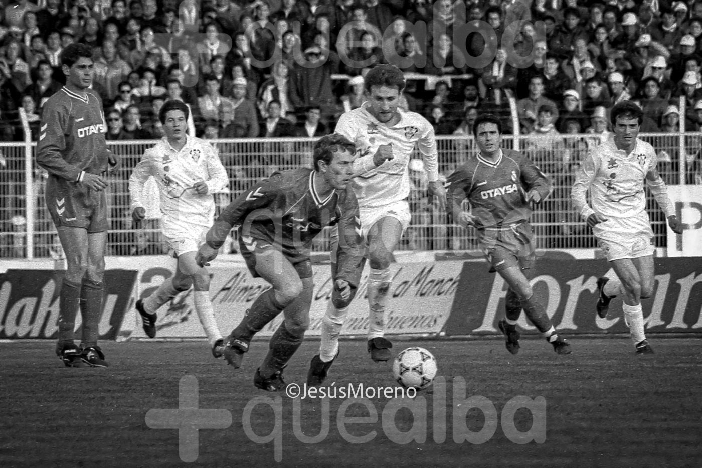 En los banquillos, Leo Beenhakker por el Real Madrid y Benito Floro por el Albacete. Precisamente, el míster del Alba había declarado antes del juego: “El Madrid depende de la calidad individual, no me motiva técnicamente”. Los goles de Hierro, Hagi y Llorente “acabaron con las esperanzas” de la victoria albaceteña. El primer envite oficial se saldó con derrota. El Albacete lo intentó, Corbalán anotó un tanto, pero no pudo superar al entonces líder de Primera División. Al terminar el partido, comentaba Zalazar al periodista Juan Carrizo: “Lo damos todo en el campo, pero no somos máquinas”.