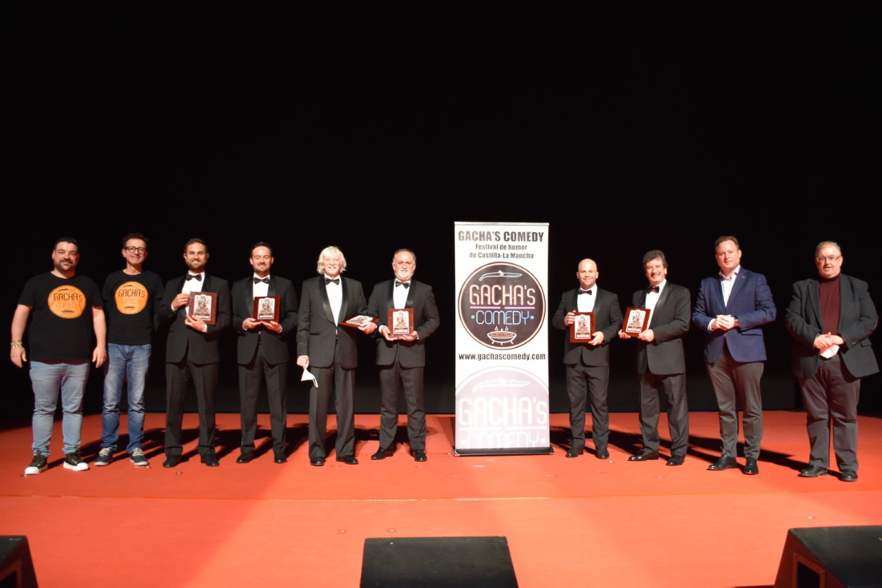 El vicealcalde y concejal de Cultura, Vicente Casañ, y el director gerente de Cultural Albacete, Ricardo Beléndez, junto a los directores del festival, Jesús Arenas, y Carlos Martínez, participaron en la entrega de esta distinción que el veterano grupo, que con 55 años de experiencia en los escenarios, recibió por parte de este joven festival de humor que, edición tras edición, crece en espectáculos y en calidad.