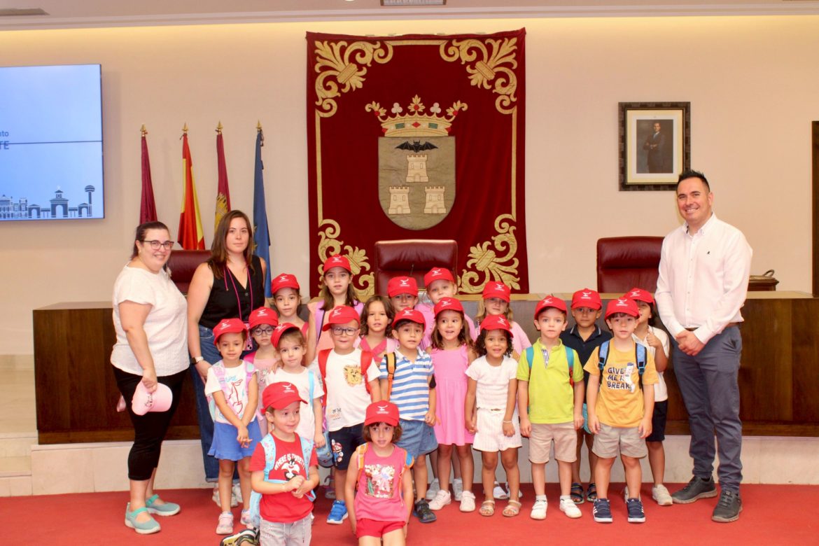 El concejal de Educación, Pascual Molina, ha recibido en el Salón de Plenos a un grupo de 30 chavales de entre 3 y 11 años de la Escuela de verano de la Asociación de vecinos del barrio Carretas Huerta de Marzo, acompañados de sus monitoras.
