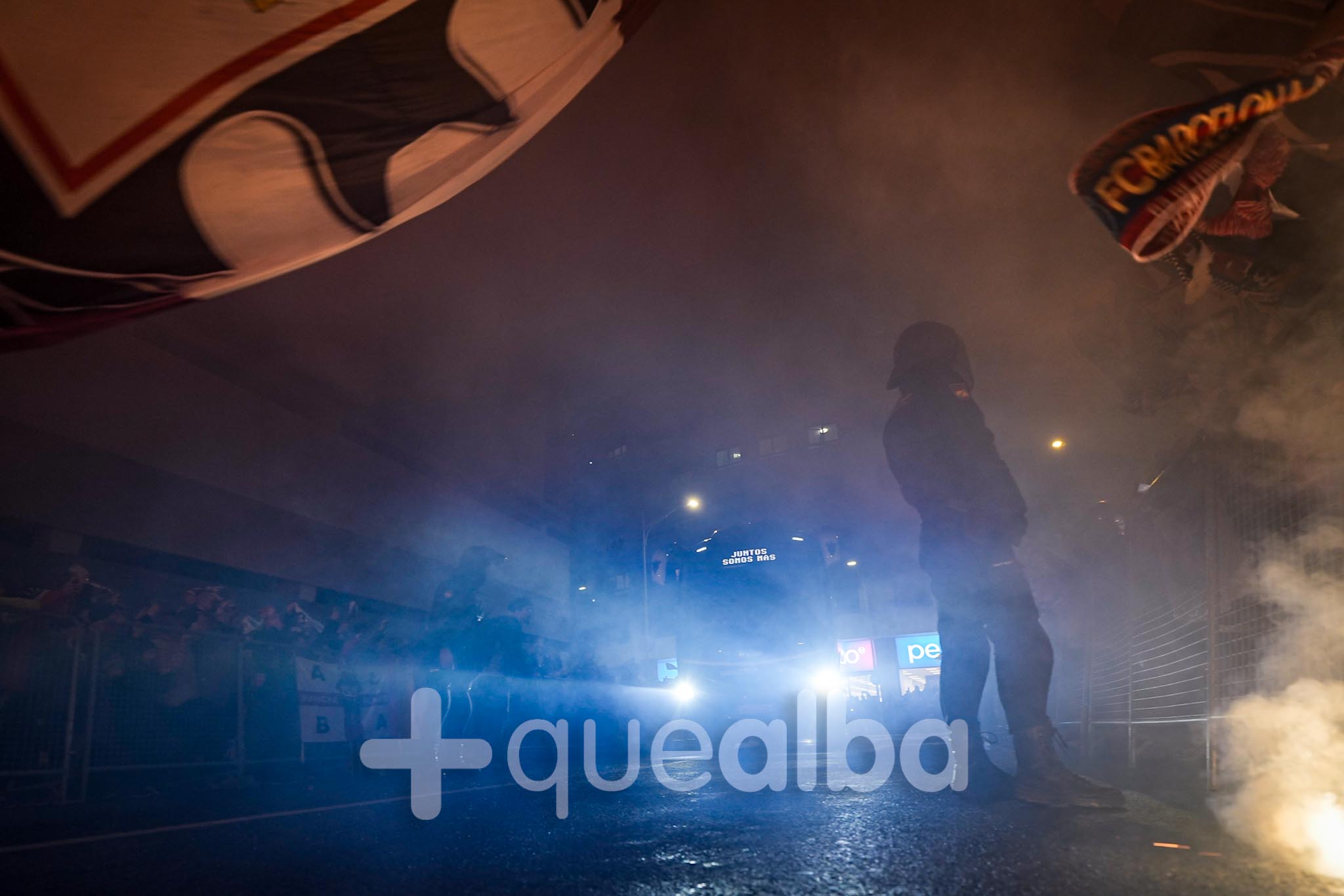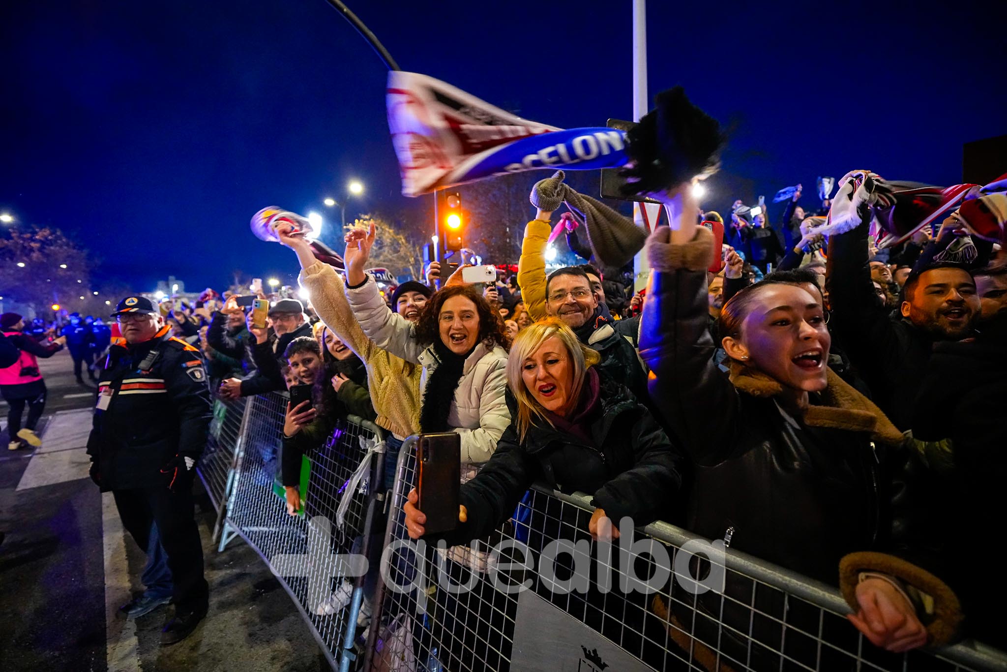 Poco después del Alba llegaba el FC Barcelona. A la llegada del autobús, lanzaban una cerveza contra el mismo y había cierta polémica con un aficionado que lucía la camiseta del Barcelona y que se subía a una farola para ver el paso de su equipo más de cerca.