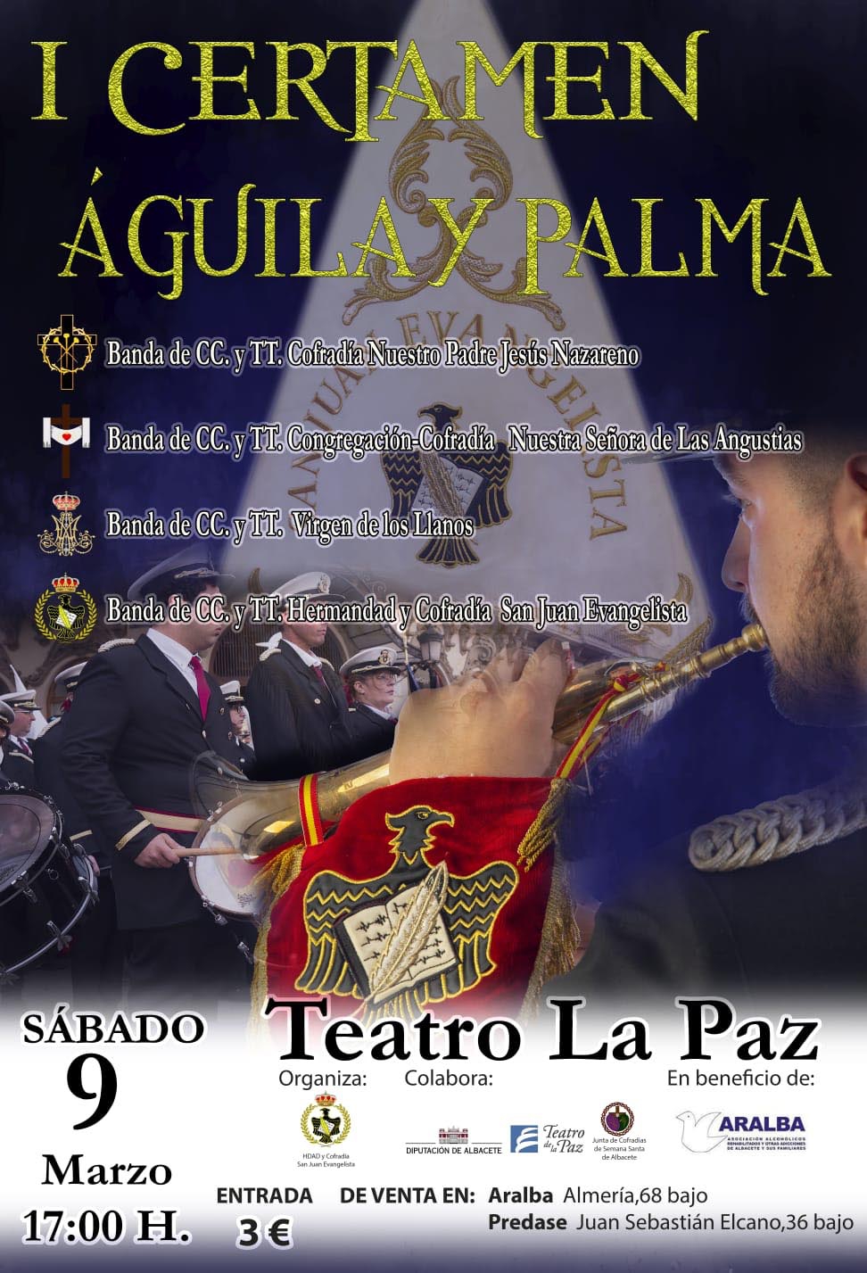 Mañana día 9 de marzo a las 17,00 h. La Hermandad Cofradía de Nazarenos San Juan Evangelista, realiza el primer Certamen «Águila y Palma» a favor de ARALBA Albacete.