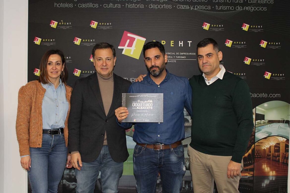 El alcalde de Albacete, Manuel Serrano, ha felicitado a los 59 participantes de las I Jornadas de la Croqueta que durante el pasado mes de noviembre se celebraron con gran éxito en nuestra ciudad, contando con una subvención de 9.000 euros por parte del Ayuntamiento, y de manera especial, a los tres ganadores, durante el acto celebrado en la sede de la Asociación Provincial de Empresarios de Hostelería y Turismo (APEHT), acompañado por su presidente, David Giménez, y la concejala de Turismo, Rosa González de la Aleja.