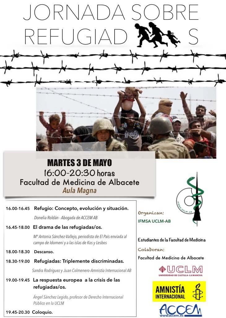 Esta iniciativa, «Jornada sobre refugiadas/os» tendrá lugar el próximo día 3 de mayo en el aula Magna de la Facultad de Medicina de Albacete de 16:00 a 20:30. La entrada es gratuita y está abierta a todo el público.