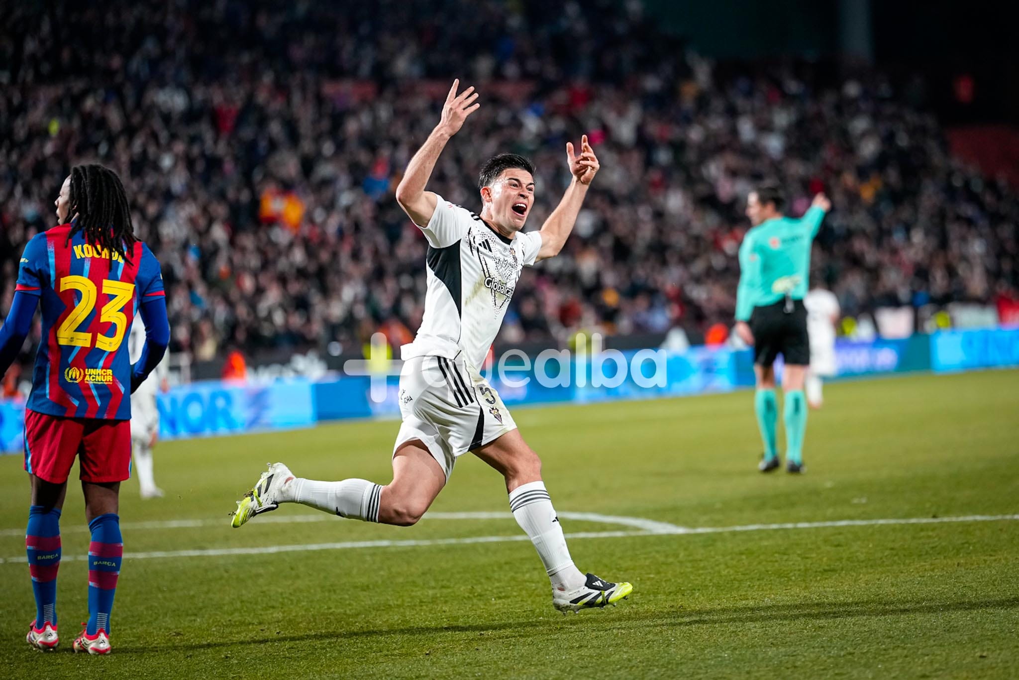 El encuentro se había ido 0-1 al descanso, con gol de Lamine Yamal y Araújo hizo el segundo para los catalanes en el 56. Ambientazo pese a la derrota en un Carlos Belmonte espectacular, que aplaudió la hazaña de su equipo aunque esta vez el Alba no pudo seguir haciendo historia en la Copa del Rey.