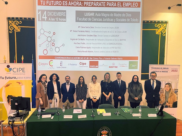 En la jornada de empleo, presentada y moderada por María Gómez Rico, catedrática de Marketing de la UCLM, también participaron la directora general de Empleo de la JCCM, María Elena García Zalve; la coordinadora de empleo de la D.G. de Empleo de la JCCM, María Teresa Fernández Muñoz; o la asesora jurídica laboral en FEDETO, Marisa Nevado Maestre, entre otros responsables empresariales.