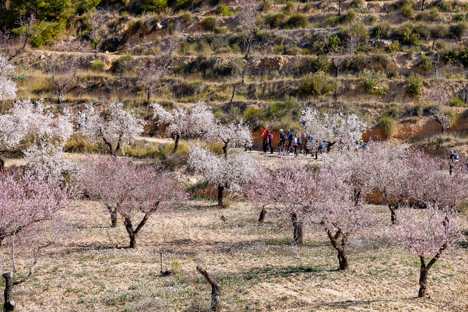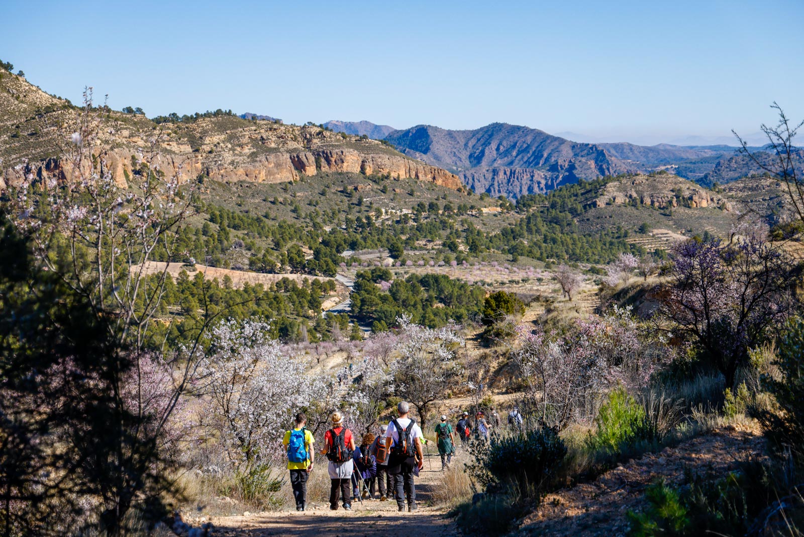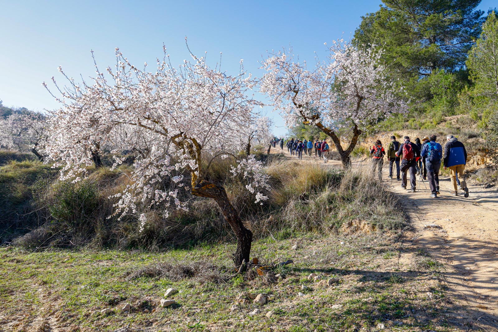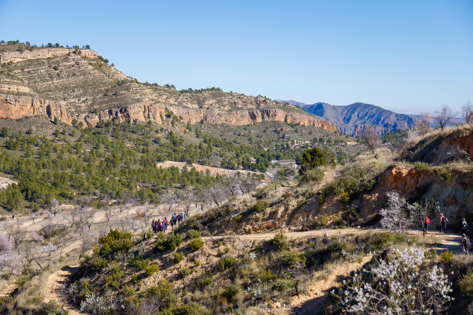 Entre distintos cultivos, principalmente almendros -de gran belleza ya en flor-, junto a algún olivo, continuarían la marcha ya de regreso al municipio. Así, y tras cruzar la carretera de Elche de la Sierra, subirían por la Quebrada, hasta llegar a la Cantarería.