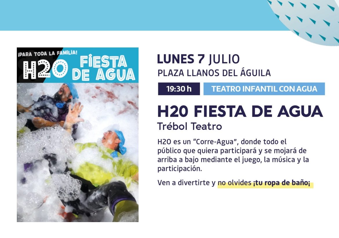 El Ayuntamiento continúa acercando cultura y diversión a todos los rincones del municipio con su programación del Verano Cultural 2025. Esta tarde, a partir de las 19:30 horas, la Plaza Llanos del Águila acogerá la ‘H2O Fiesta de Agua’, un espectáculo familiar de teatro infantil a cargo de la compañía Trébol Teatro.
