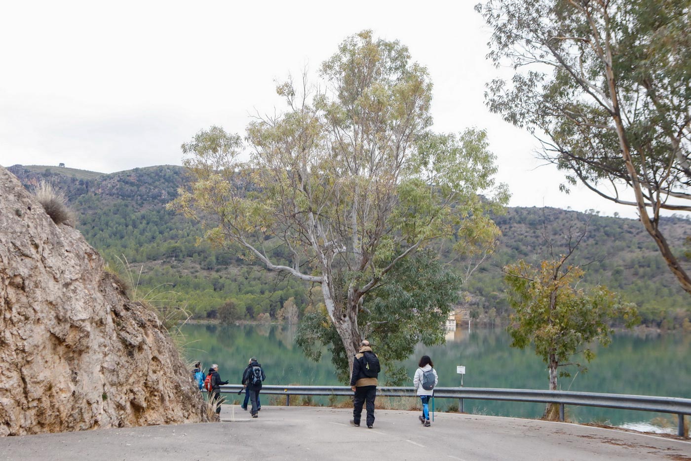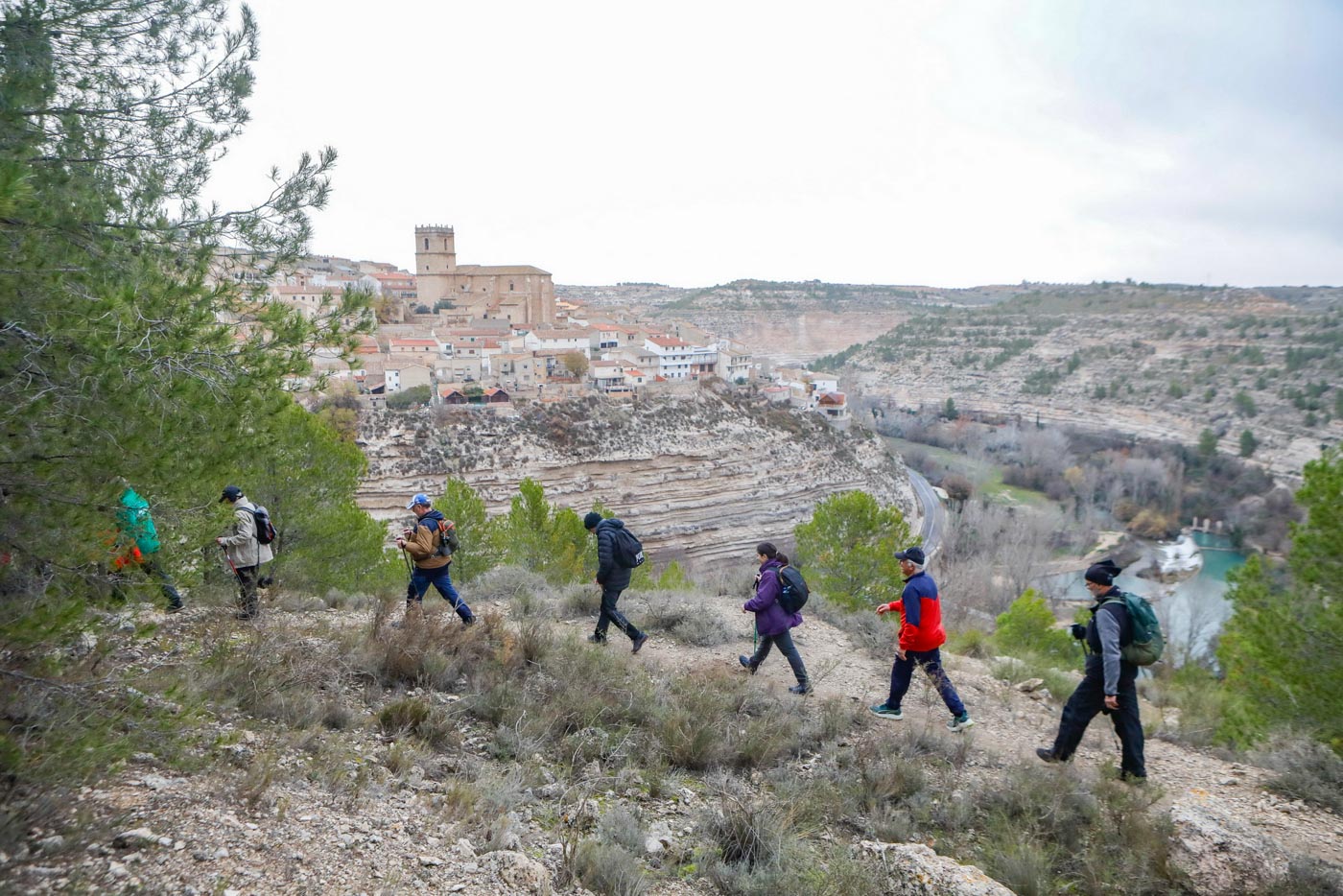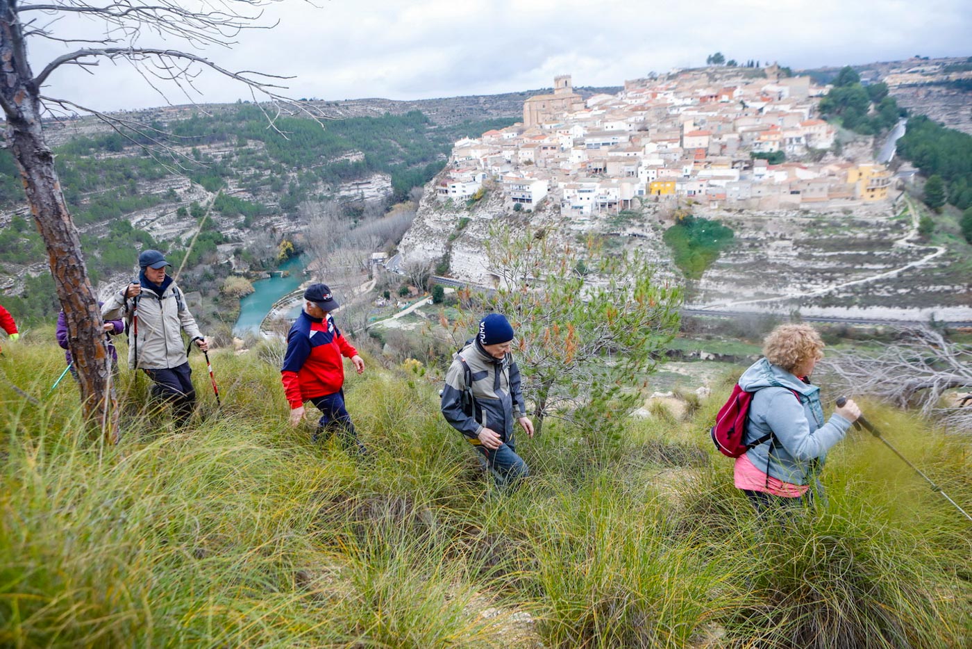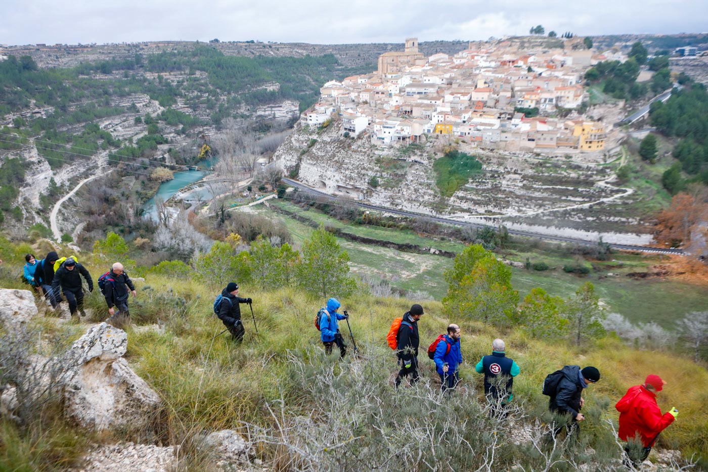 Con el cielo cubierto, sobre las nueve de la mañana, desde la puerta del Ayuntamiento, que se sitúa frente a la iglesia, arrancaría la marcha, descendiendo por las peculiares calles de Jorquera hasta llegar al cauce del río Júcar. Cruzarían este por el puente, para girar a la derecha y caminar por la orilla a pie de roca, hasta comenzar a ascender por la antigua calzada romana, para adentrase en un bosque de pinos hasta llegar al primero de los miradores, con la maravillosa vista del pueblo al frente y todo el valle que forma el Júcar a su paso.
