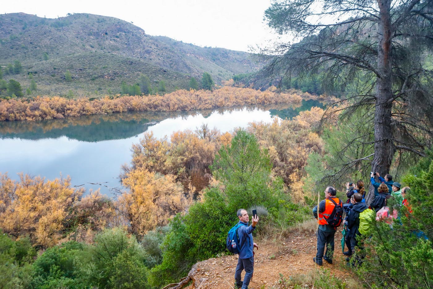 Pasarían cerca de la casa de los Majales, abandonando la senda para coger una pista y perder, de momento, la vista del embalse. Al poco llegarían al Barranco de Piqueras, y entre monte bajo, por un sendero mal definido, hasta unas rocas que albergan una pequeña oquedad utilizada como refugio para el ganado, la conocida Tiná, en este punto volvería a aparecer de nuevo el embalse, con unas preciosas vistas, con gran cantidad de árboles y arbustos, con sus ocres colores, sumergidos parcialmente en el agua.