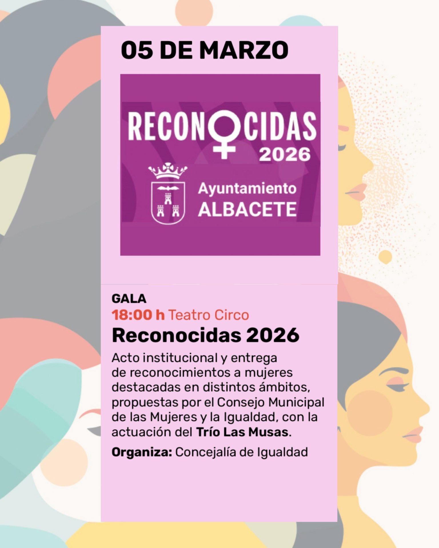 El Teatro Circo acogerá mañana, 5 de marzo, a las 18:00 horas, la gala Reconocidas 2026, uno de los actos institucionales más significativos del Ciclo ELLAS, impulsado por el Ayuntamiento de Albacete, en el que se rendirá homenaje a mujeres de la ciudad por su trayectoria, compromiso y contribución en distintos ámbitos de la vida social, cultural y profesional.
