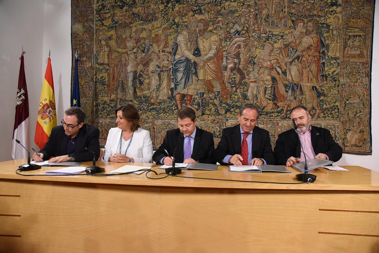 De esta forma lo ha avanzado García-Page tras rubricar este documento con el secretario general de la UGT, Carlos Pedrosa Serrano; el secretario general de CCOO de Castilla-La Mancha, Francisco de la Rosa; y el presidente de CECAM, Ángel Nicolás; en un acto que ha tenido lugar en el Palacio de Fuensalida, en Toledo, y del que también ha participado la consejera de Economía, Empresas y Empleo, Patricia Franco.